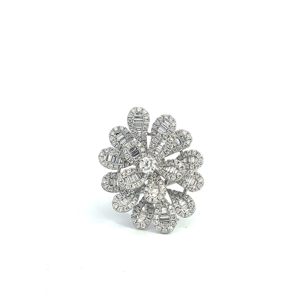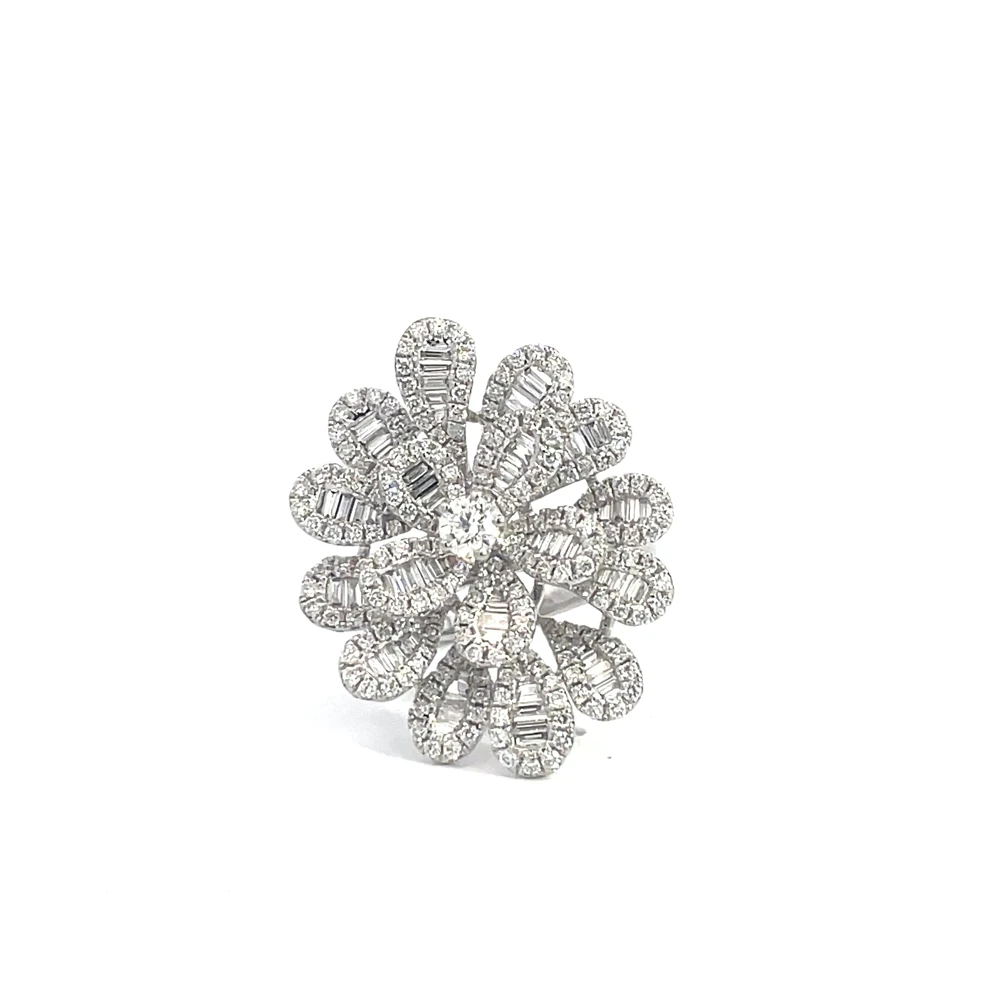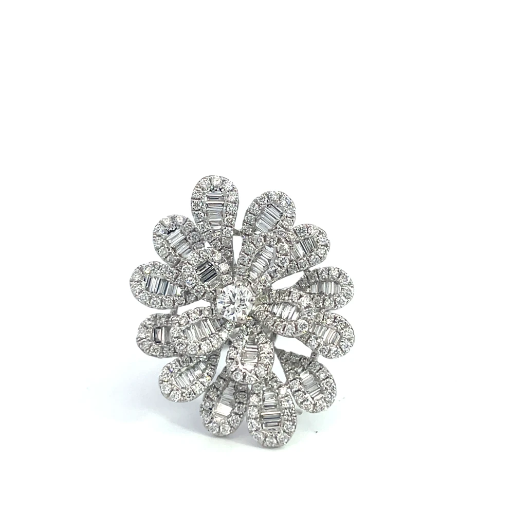 Crafted in 14-karat gold, this sculptural ring features a floral-inspired design set with 2.50 carats of round and baguette-cut diamonds. Weighing 9.60 grams, it combines volume and brilliance — a bold yet feminine piece with timeless presence.