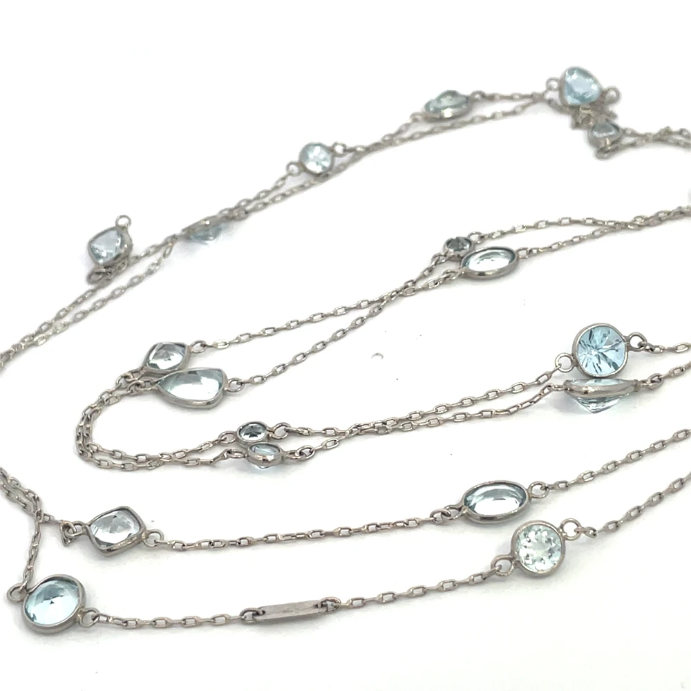 Handcrafted in platinum, this necklace is set with 11.48 carats of natural aquamarine in round, oval, and pear-shaped cuts. A clean, fluid silhouette that highlights the soft blue hues of the stones.