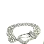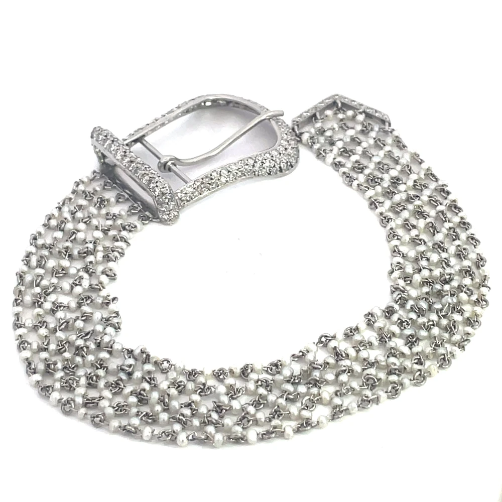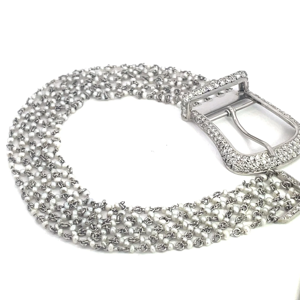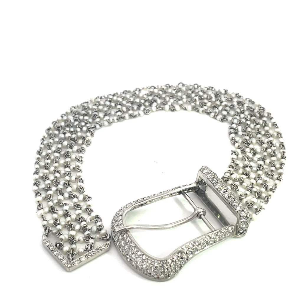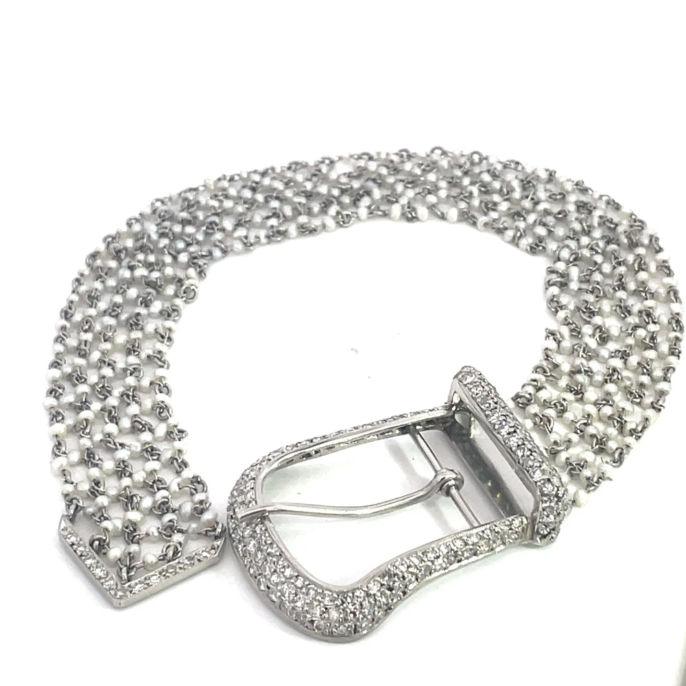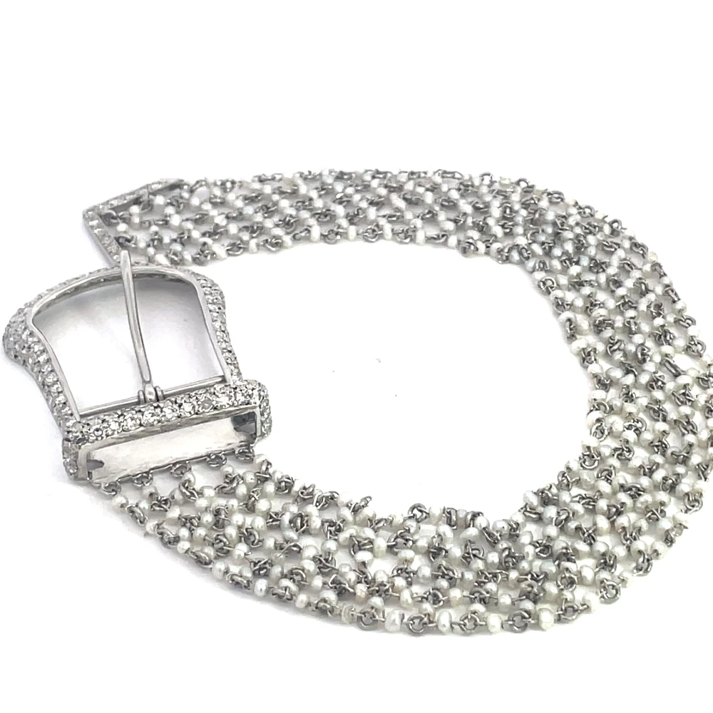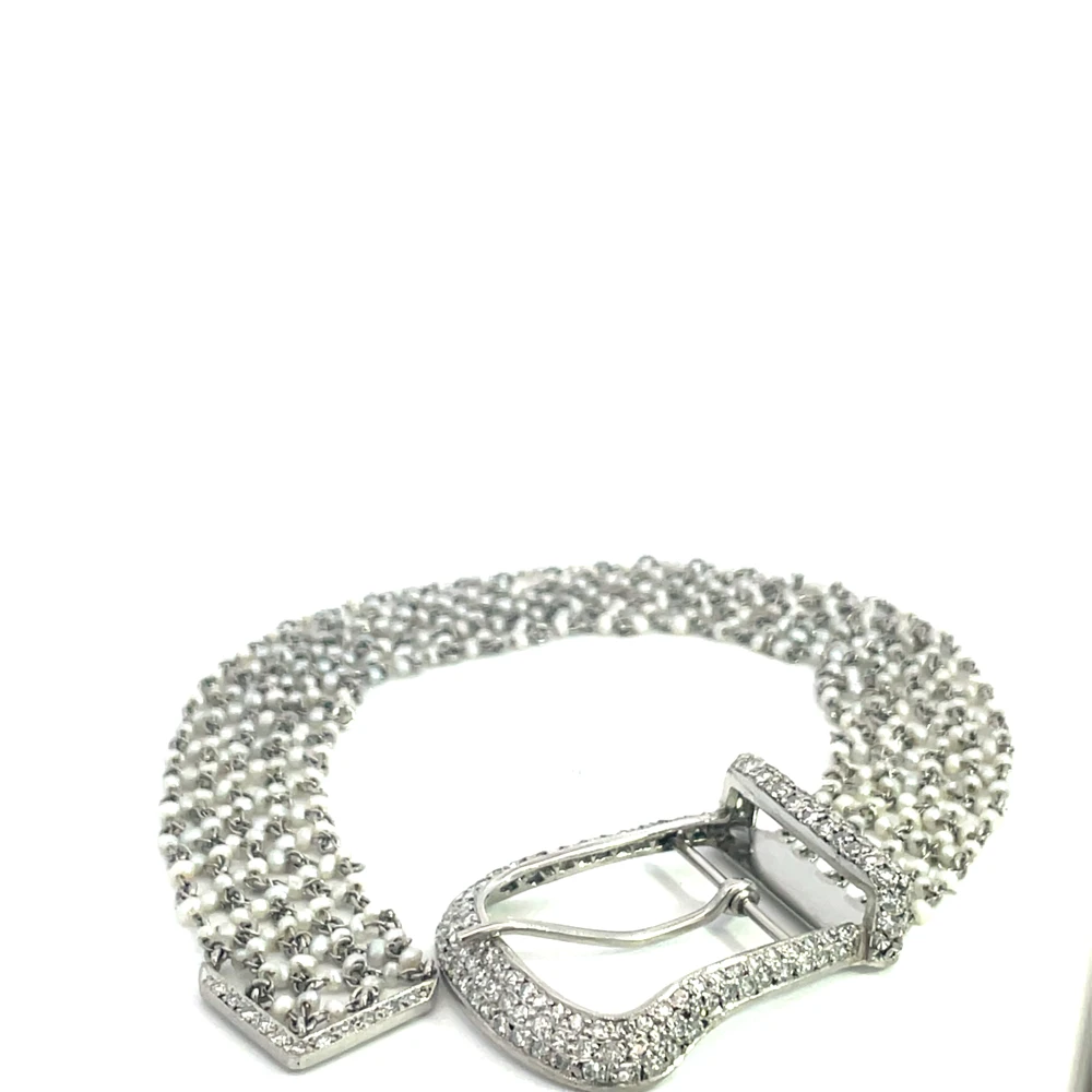 This bracelet is crafted in platinum and set with pearls and 1.70 carats of brilliant-cut diamonds. The design draws inspiration from the elegance and geometry of the Art Deco period.