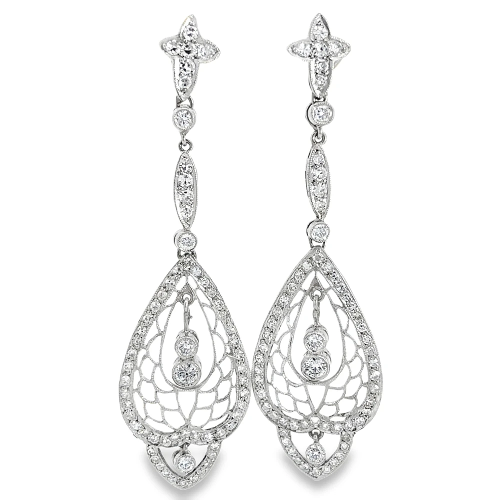 Handcrafted in platinum with 14-karat gold posts, these drop earrings are set with approximately 2.50 carats of brilliant-cut diamonds. Inspired by the Art Deco period , the openwork design features articulated diamond details that highlight the geometry and movement of the piece.