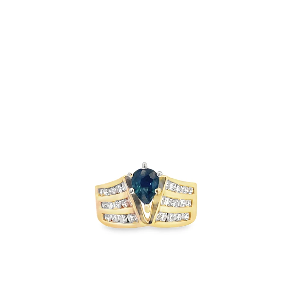 Crafted in 14-karat gold, this ring features a natural sapphire at its center, accented with 0.90 carat of full-cut diamonds. Weighing 8.31 grams, it offers a balanced composition of color and brilliance — classic in essence, striking in execution.