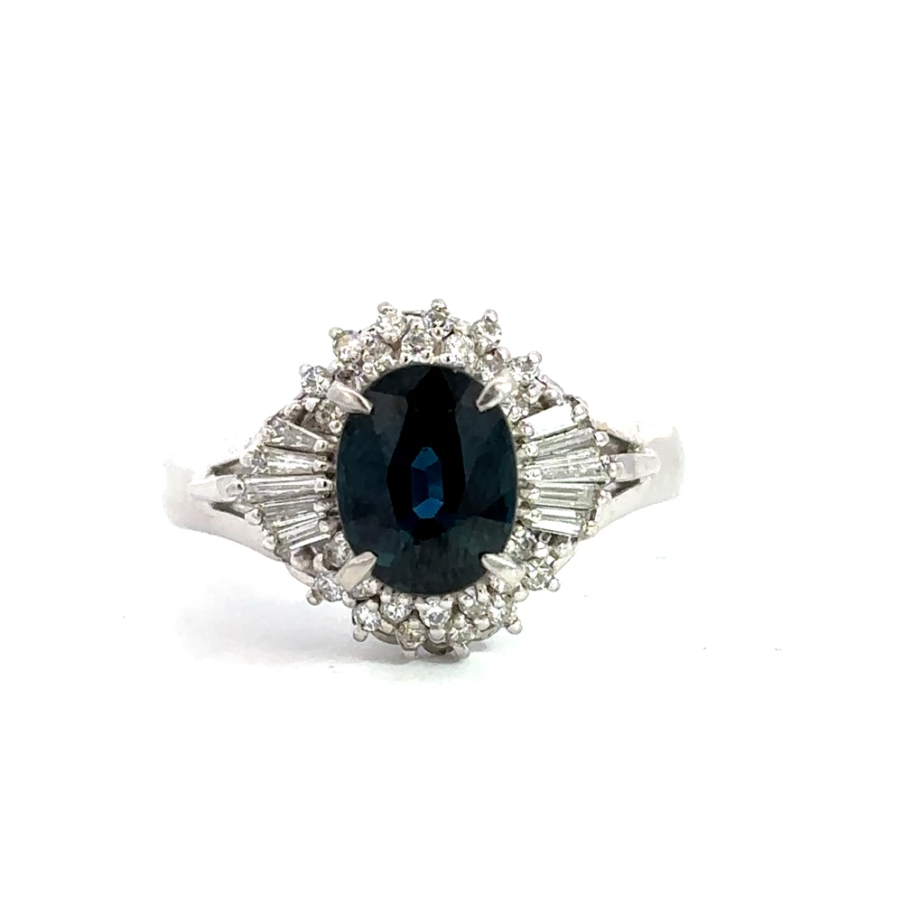 Crafted in platinum, this ring features a natural oval sapphire at its center, framed by 0.26 carat of diamonds. Weighing 4.10 grams, it offers a classic composition with subtle contrast — elegant, enduring, and designed to be treasured.
