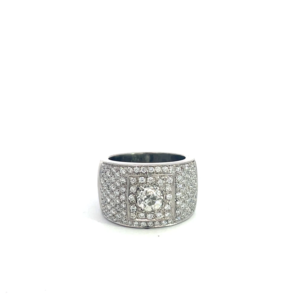 Crafted in 18-karat white gold square, this ring features a 0.80-carat all-cut central diamond, complemented by smaller diamonds totaling 1.20 carats. With a total diamond weight of 2.00 carats and weighing 11.85 grams, it offers a harmonious blend of brilliance and craftsmanship — designed to captivate beyond the first glance.